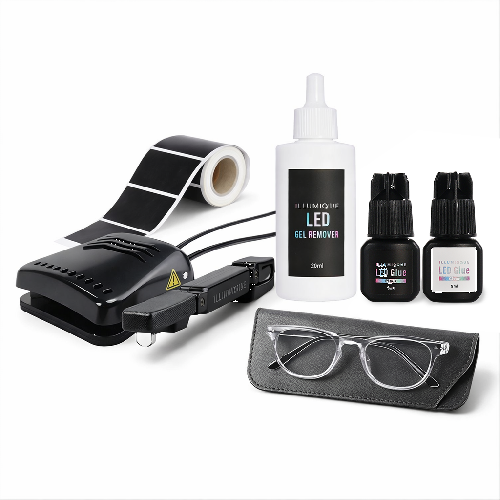 【使用方法】 1. 施術前に前処理剤などでまつ毛を 清潔な状態にしてください。 2. テープワークの最後に、眩しさから目を守るためのLEDライト保護シールを貼ります。 3. LED専用グルーを使用し、 自まつ毛に馴染ませながら装着します。※【T3】ILLUMIQQUE LED Glue 5mlを推奨 4. フットペダルを操作し、使用グルーに合わせて 1~2秒照射し硬化させてください。
